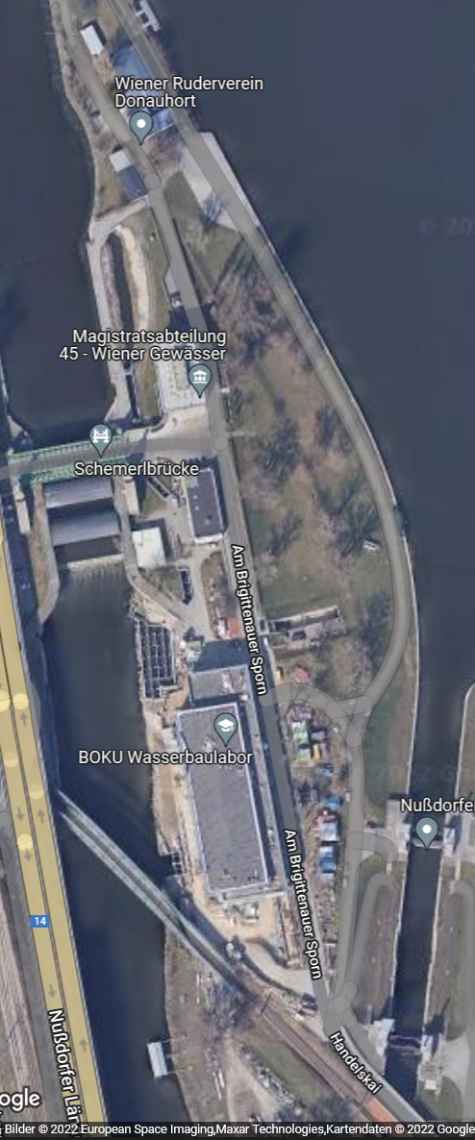 Bildaufnahme des Gebäudes Mitte November 2022 über dem Donaukanal. Mittlerweile sind das Logo „BOKU“ und die Beschriftung oben „Wasserbaulabor“ und darunter „River Lab“ auf dem Gebäude oben links zu sehen. An beiden seitlichen Wänden links und rechts sind auch jeweils Logos angebracht, jedoch hier nicht zu sehen. Sonniges, kaltes und wolkenfreies Wetter bei etwa 4 Grad.